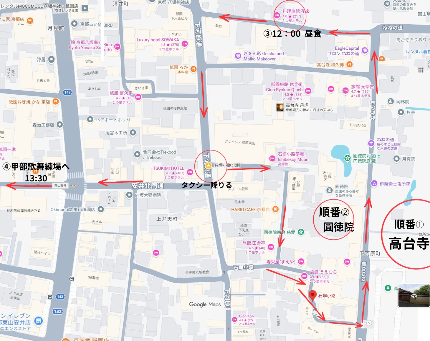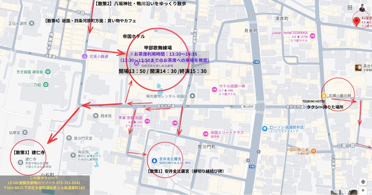 ・祇園甲部歌舞練場から京都鴨川リゾートホテル ルアンへの道順(900m 車で4分)