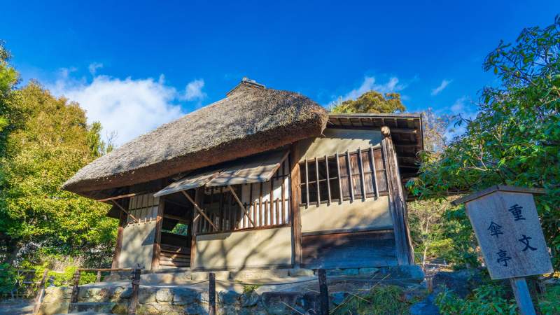 ↑ 茶室(傘亭・時雨亭):伏見城から移築された利休好みの珍しい構造の茶室。