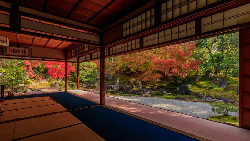 庭園:伏見城の化粧御殿前庭を移築した北庭などを有し、枯山水(かれさんすい)と池泉式を組み合わせた国指定名勝庭園として知られます。建物・襖絵:方丈(本堂)内部には金地の松竹梅や雪月花、白龍図など、桃山〜江戸初期の豪華な襖絵意匠が伝わり、秀吉好みの華やかな文化を今に伝えています。