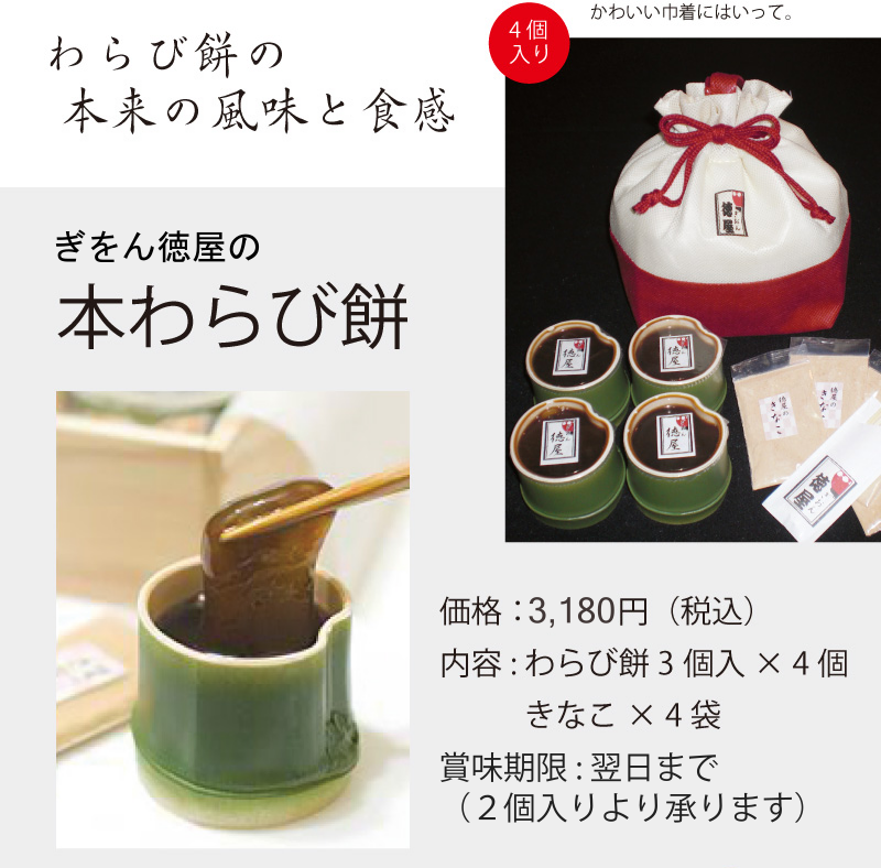 高級本わらび粉のみを使用し(わらび粉100%のわらび餅)、上品な甘さの和三盆糖と合わせて丹念に練り上げた本わらび餅です。練り上げてすぐ黒蜜に浸すことで、ご自宅でもわらび餅本来の柔らかい食感をご堪能いただけます。席数は56席。※よく見かけるわらび餅は、タピオカから採られたデンプン使用。