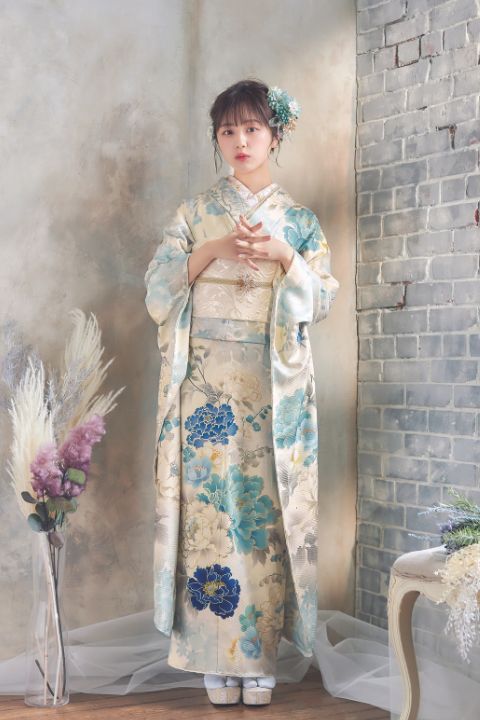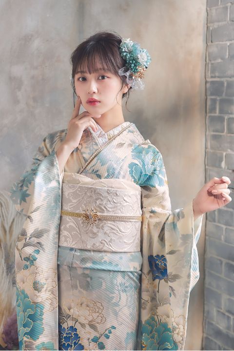 くすみカラーとは、淡く抑えた色調のことを指します。この振袖には、ベージュ、グレー、くすみピンク、くすみブルーなど、落ち着いた色合いが使用され、上品で控えめな雰囲気を醸し出しています。 デザインは非常にシンプルで、余計な装飾を排し、素材そのものの美しさや質感を引き立てるミニマリズムが採用されています。