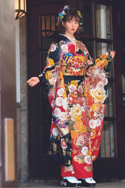 このように現代風にアレンジされた古典柄の振袖は、伝統的なデザインを保ちながら、色彩や構図、配色の工夫などでモダンな雰囲気を取り入れています。現代感を演出するために、パステルカラーやビビッドカラーが用いられることが多いです。伝統的な色合いを活かしつつ、よりカラフルで明るい色使いも特徴です。柄の大きさや配置がダイナミックになり、全体のバランスを現代風に整えています。例えば、大柄の花模様が振袖全体に大きく描かれていることや、部分的に大胆な抜け感を作るなどの工夫が見られます。古典的なモチーフに、今風のポップアートや抽象画の要素を加えていることもあります。例えば、伝統的な花柄に、モダンな幾何学模様を組み合わせることで、よりスタイリッシュな印象に仕上げています。