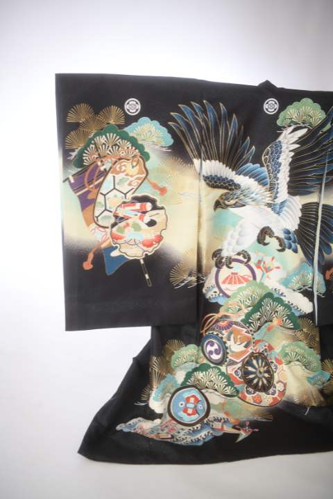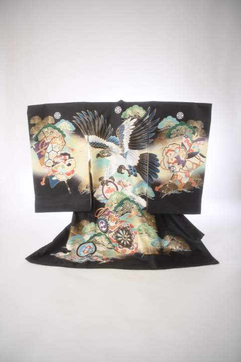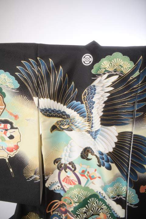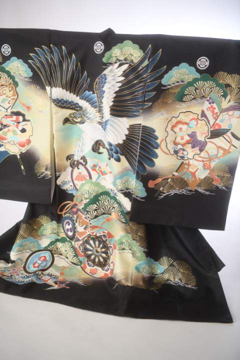 黒色。鷹、雪輪、老松が描かれたお着物です。