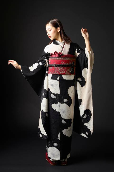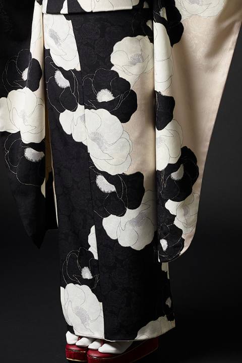 この振袖は、ポリエステル生地の特性を生かした染色・プリント技法によって、黒と白のコントラストをくっきりと表現しています。