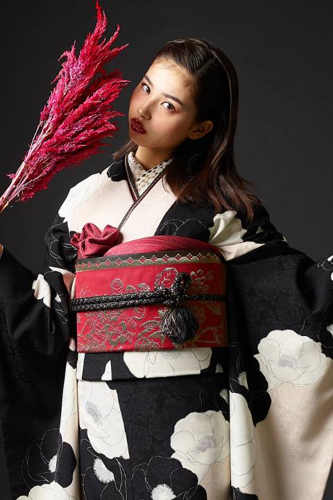 黒と白のコントラストが印象的なモノトーン振袖は、成人式の式典・同窓会・二次会・イベントなど「少し周りと差をつけたい」シーンに特におすすめです。