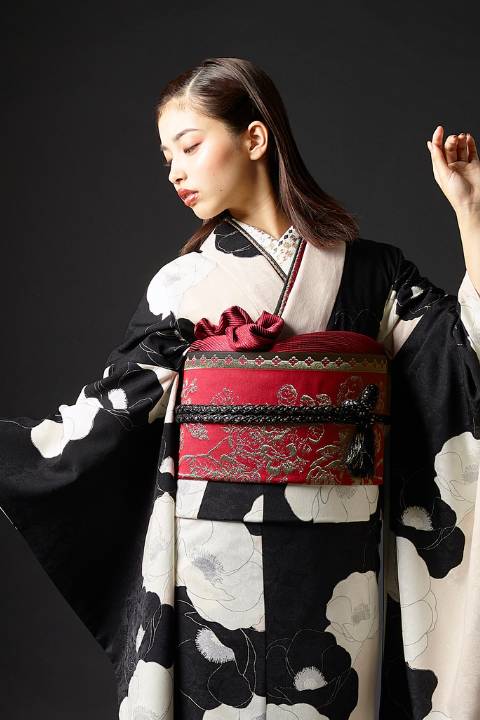 シンプルな黒×白のモノトーンでまとめながら、細部の柄づけやレイアウトにこだわった、モードテイストの振袖レンタルセットです。