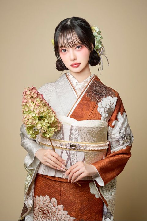 顔まわりを明るく見せてくれる配色バランスで、前撮り・当日スナップともに、ブランド振袖らしい世界観のある写真を残していただけます。