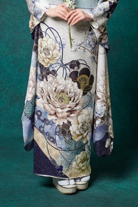 グレーをベースに必要なところだけ青を効かせているので、清楚さと華やかさのバランスがよく、お母様やご家族にもご好評いただくことが多い一着です。